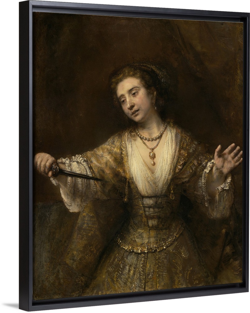 <p>Lucretia, by Rembrandt van Rijn, 1664, Dutch painting, oil on canvas. Lucretia, wife Lucius Tarquinius Collatinus, was a 6th century BCE virtuous Roman matron who killed herself after being raped by Etruscan king's son, Sextus Tarquinius. The furor caused</p>