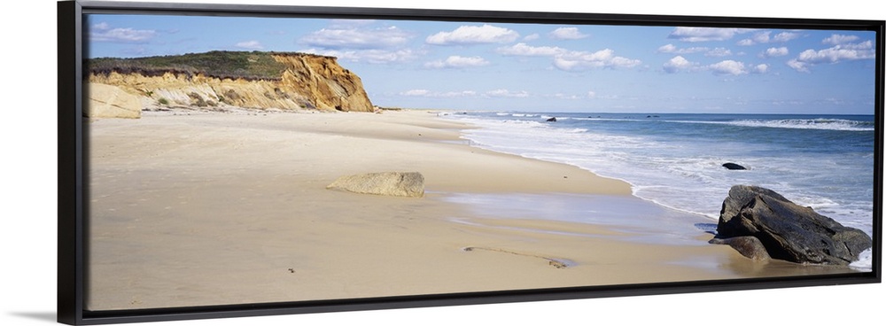 <p>Panoramic photograph of shoreline with surf, large rock, and cliff in the distance under a cloudy sky.</p>