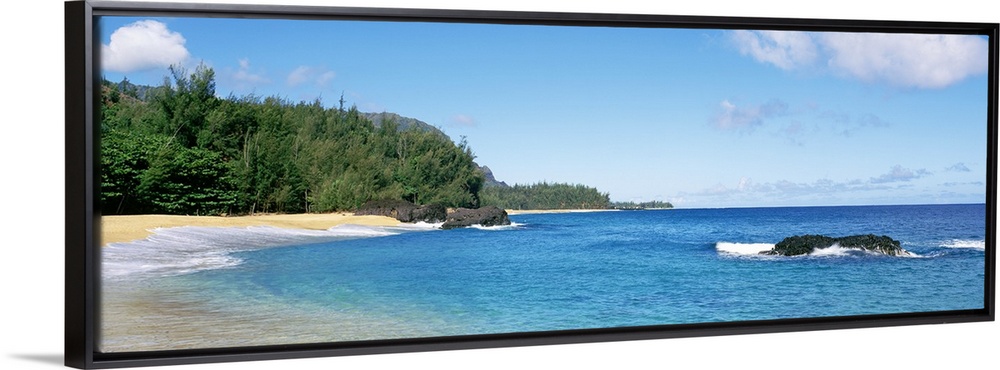 <p>Large panoramic photo of Lumahai Beach in Kauai, Hawaii during the summer.</p>