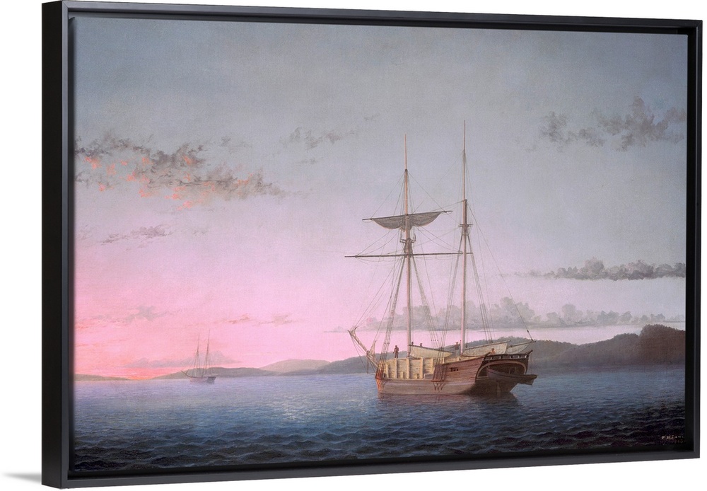 <p>Lumber Schooners at Evening on Penobscot Bay, by Fitz Henry Lane, 1863, American oil painting. Lane created marine paintings of panoramic space and luministic skies expressing a tranquil, quiet mood</p>