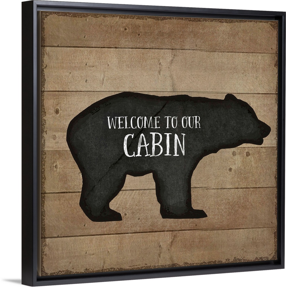 <p>"Welcome to Our Cabin" on a bear silhouette over a wooden background.</p>