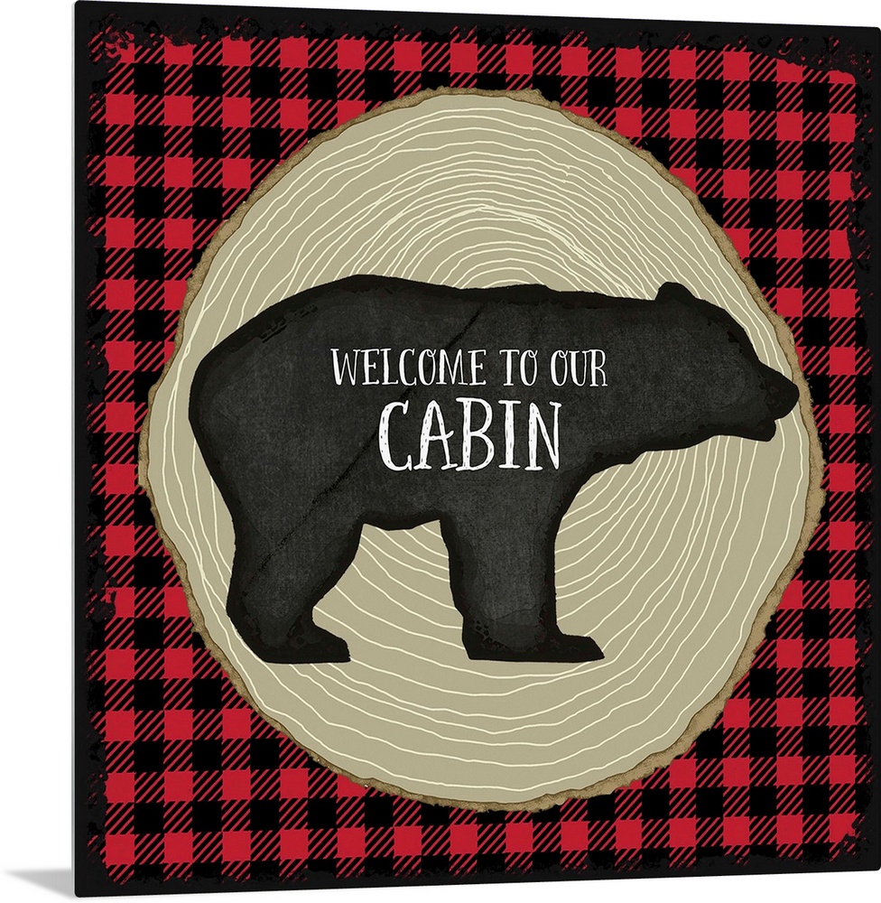 <p>"Welcome to Our Cabin" on a bear silhouette over red and black plaid and tree rings.</p>