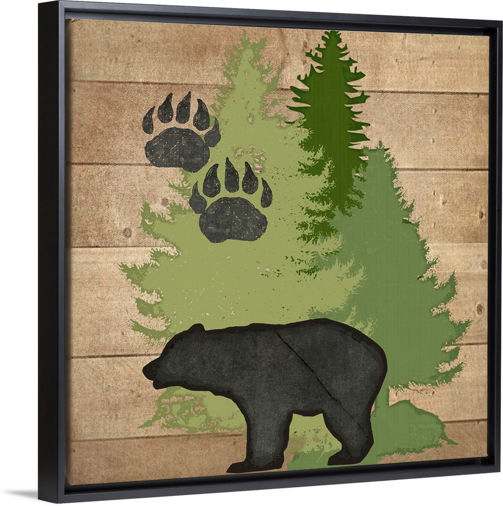 <p>Cabin decor of a bear silhouette with paw prints and pine trees.</p>