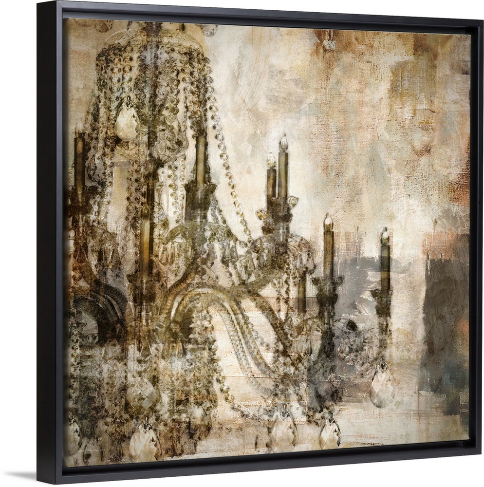 <p>A delicate chandelier is drawn against a rugged background with patches of paint placed over it.</p>