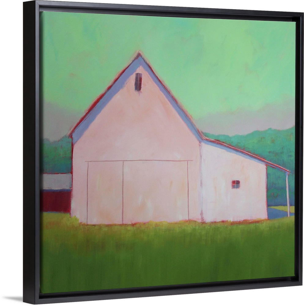 <p>Square artwork of an agricultural building on a green countryside against a bright mint sky.</p>