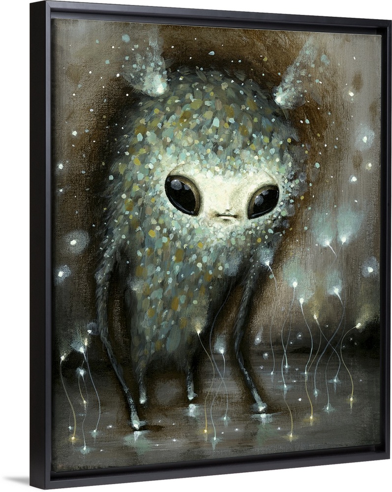 <p>Surrealist painting of a creature with glowing scales of light, surrounded by floating glowing light.</p>