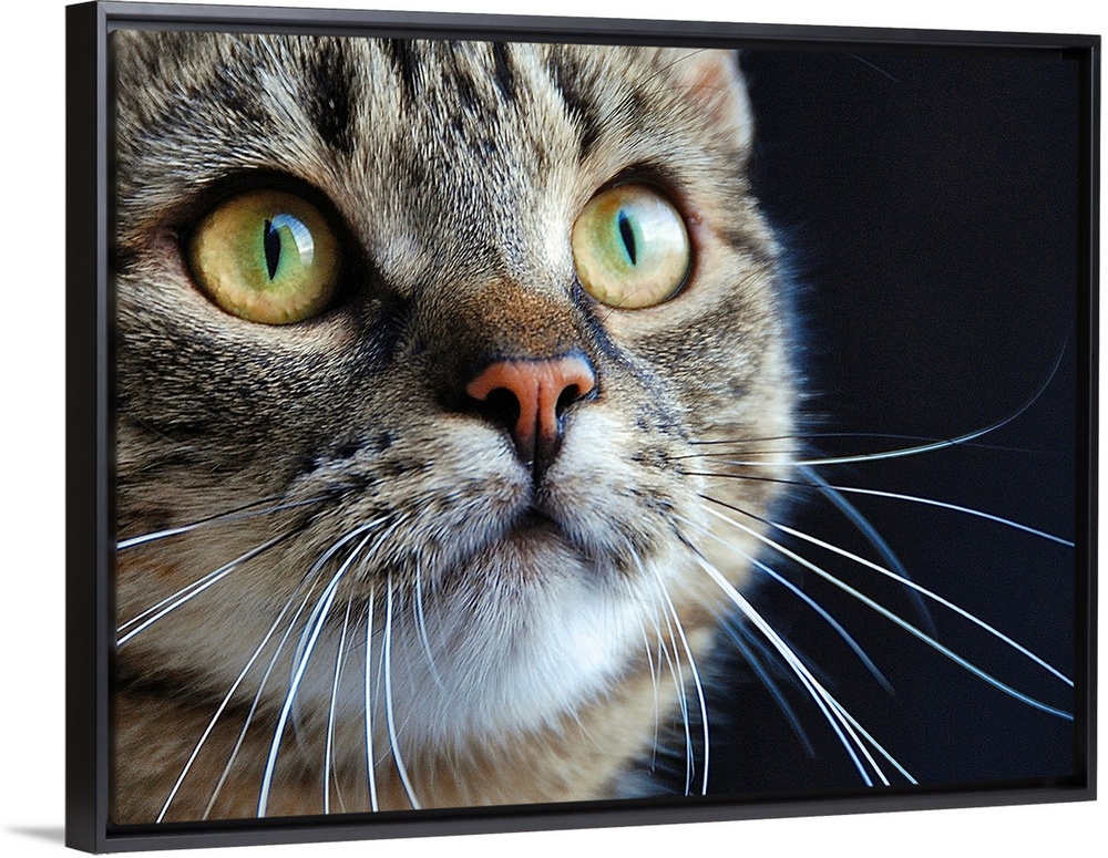 <p>Close up of a tabby cat with long whiskers and green eyes.</p>