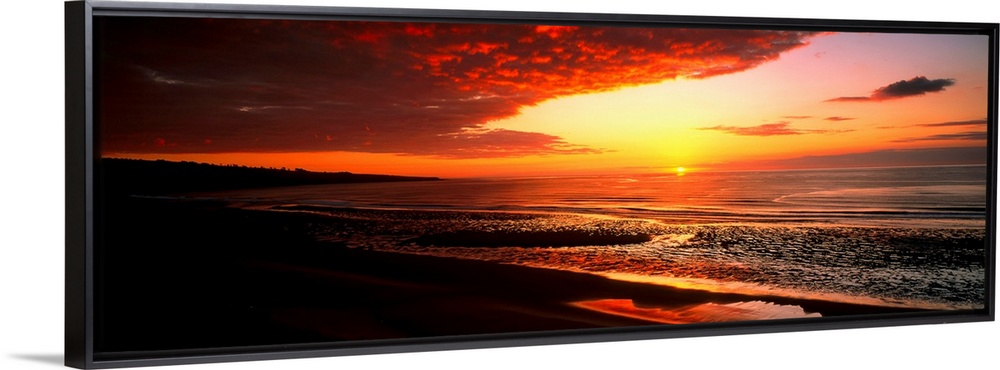 <p>This is a panoramic photograph a flat sandy beach and sunset.</p>