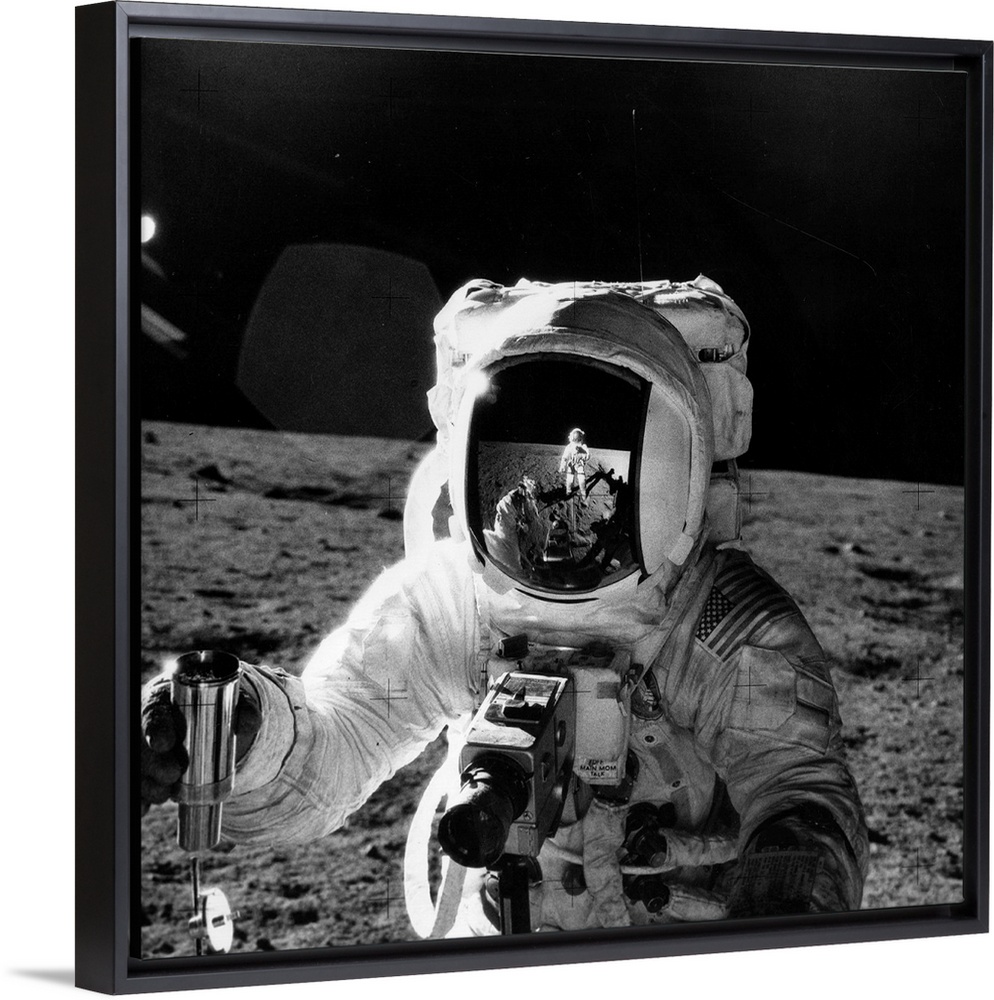 <p>Astronaut Alan Bean with a container of lunar soil collected during Apollo XII (Apollo 12) extravehicular activity He wears a checklist on his left wrist and a Hasselblad camera to record his movements The astronaut Charles Conrad who took the photograp</p>