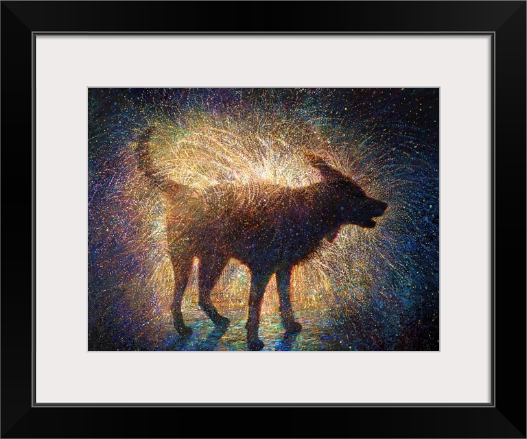 <p>Brightly colored contemporary artwork of a dog shaking off water in front of light.</p>