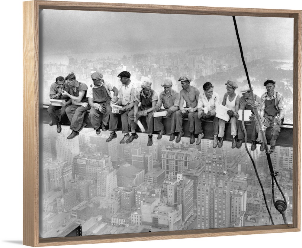 <p>While New York's thousands rush to crowded restaurants and congested lunch counters for their noon day lunch, these intrepid steel workers atop the 70 story RCA building in Rockefeller Center get all the air and freedom they want by lunching on a steel beam with a sheer drop of over 800 feet to the street level. The RCA building is the largest office building in terms of office space in the world. (original caption). Image taken 9/20/32; filed 9/29/32.</p>