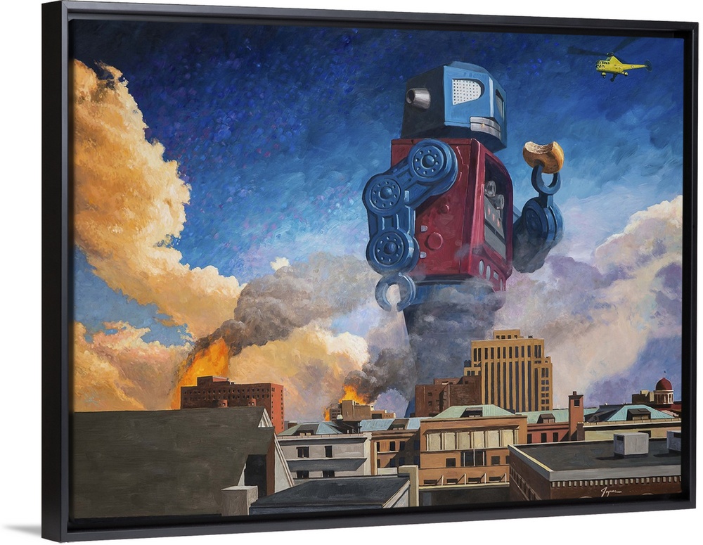 <p>A contemporary painting of a giant retro toy robot eating a donut and walking through a burning city.</p>