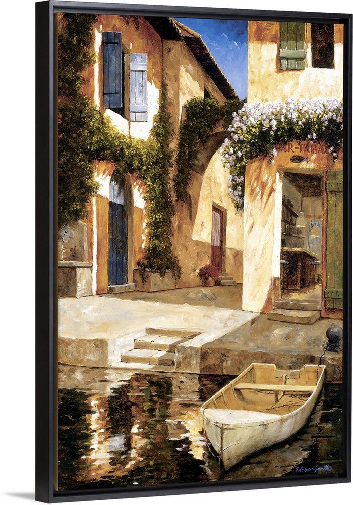 <p>Painting of a boat docked near stairs in a European village.</p>