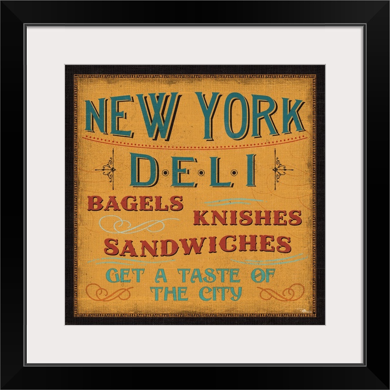 <p>A vintage-style sign for a New York deli, advertising bagels, knishes, and sandwiches.</p>