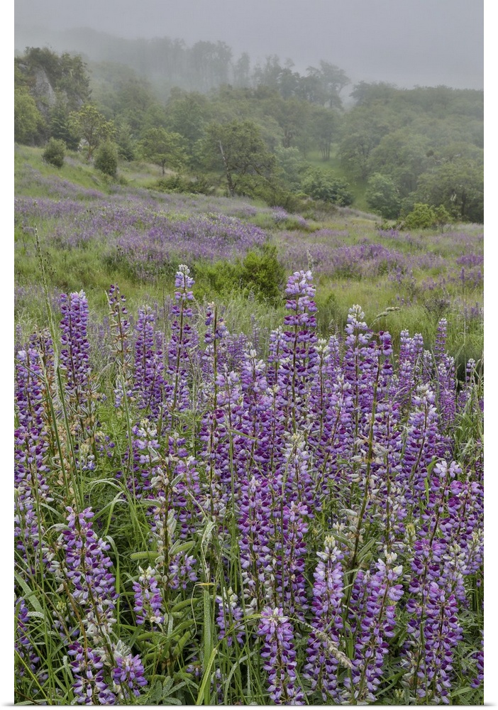 <p>Lupine and oak trees in fog Bald Hills, Redwoods National Park, California</p>