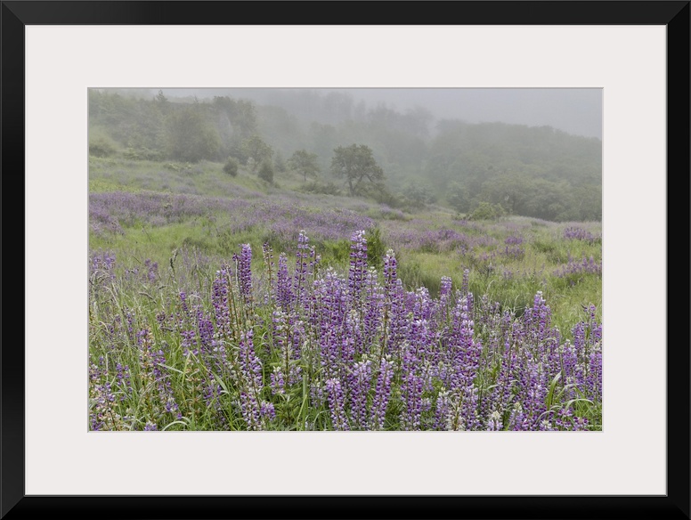 <p>Lupine and oak trees in fog, Bald Hills Redwoods National Park, California</p>