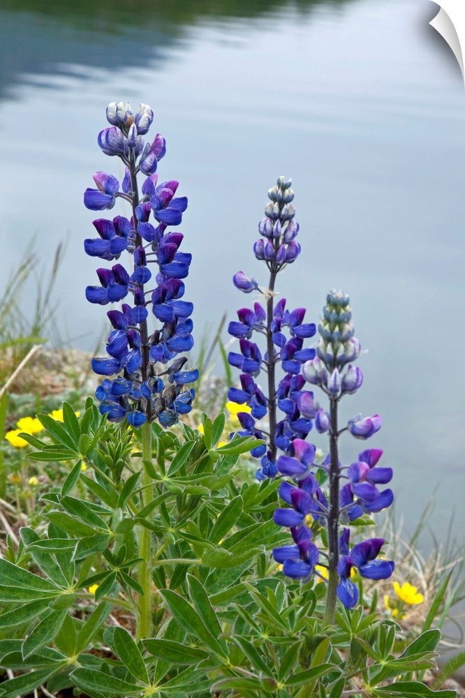 <p>Big, vertical, close up photograph of several lupine flowers surrounded by grass, at the edge of calm water in the background, in Southwest Alaska during the summer.</p>
