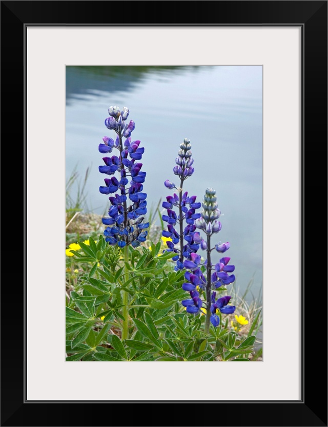 <p>Big, vertical, close up photograph of several lupine flowers surrounded by grass, at the edge of calm water in the background, in Southwest Alaska during the summer.</p>