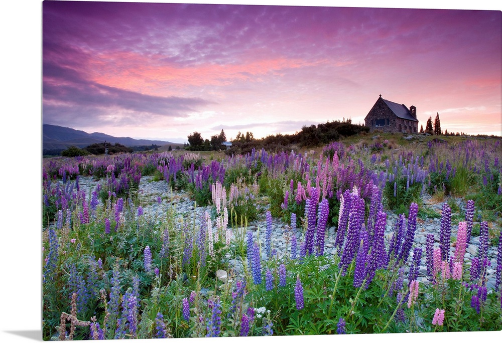 <p>Big photograph displays a house of worship in the distance sitting amongst open fields of cool toned flowers that match the color of the sky. The mountain in the far background gives a sense of depth to the house and field in the foreground.</p>
