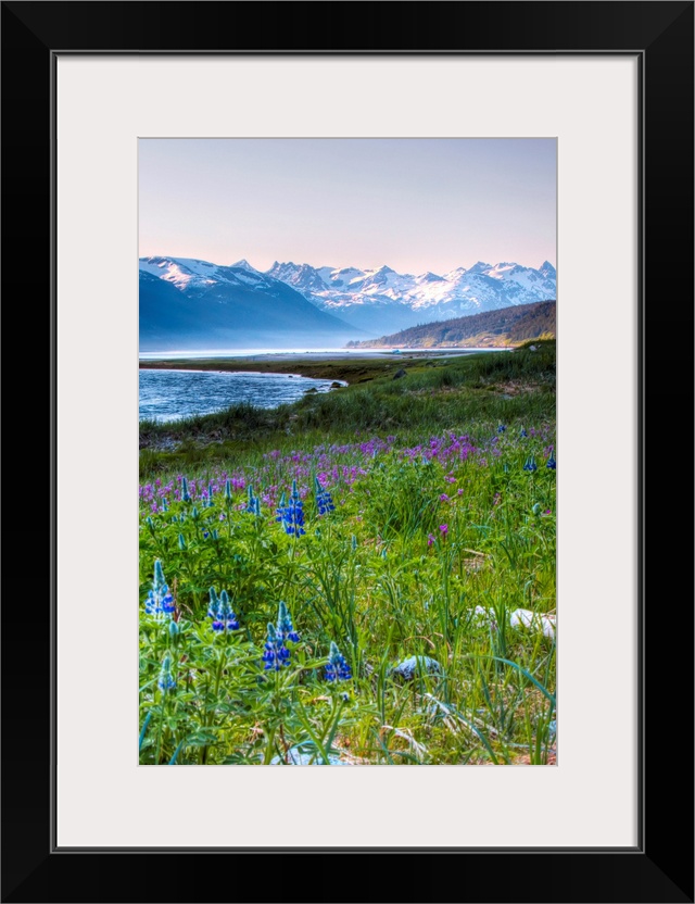 <p>This beautiful photograph is taken in Alaska with a view of snow capped mountains in the background and a field of flowers taking up most of the front of the picture.</p>