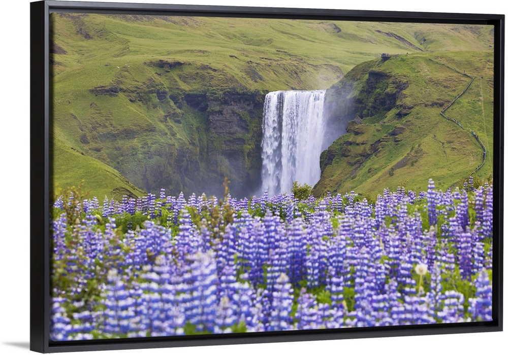 <p>Lupins wrap the green meadows around the Skogafoss waterfall, Sudurland, Iceland</p>