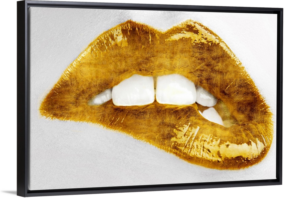 <p>Close up of a woman biting her lip with bright gold lipstick</p>