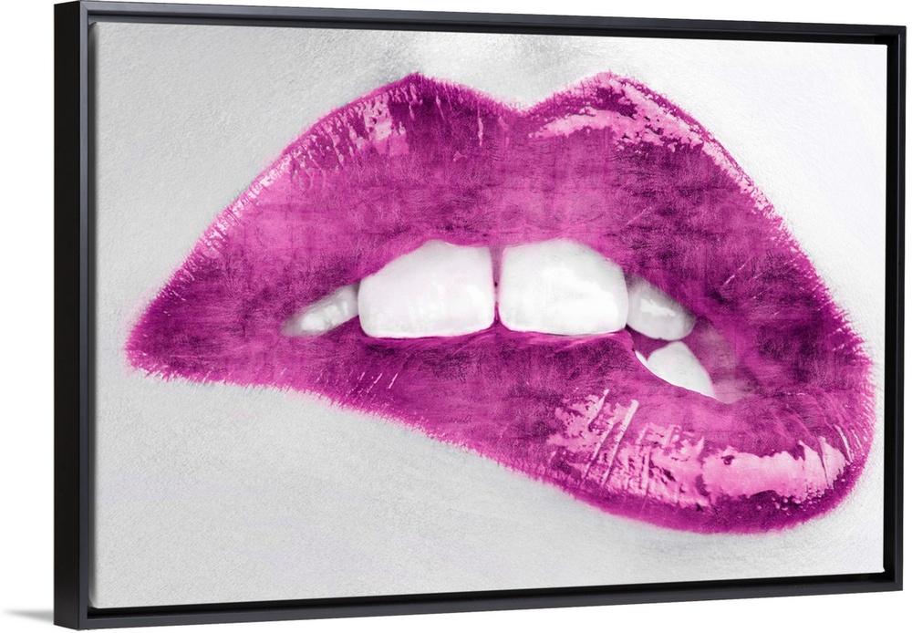 <p>Close up of a woman biting her lip with bright pink lipstick</p>