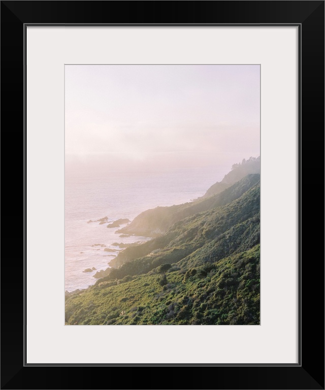 <p>A hazy photograph of a hilly coastline receding into the distance.</p>