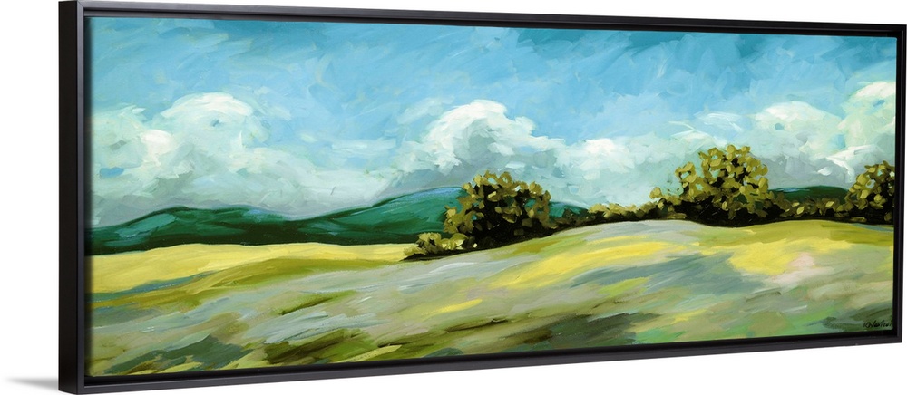 <p>A contemporary painting of a landscape of rolling hills with trees and mountains in the background.</p>