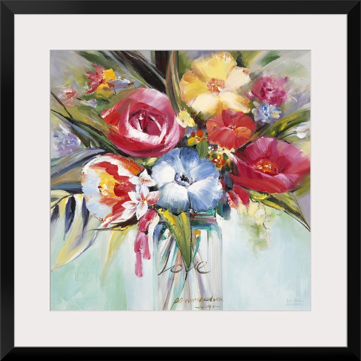 <p>Contemporary artwork of a colorful bouquet of flowers in a clear mason jar.</p>