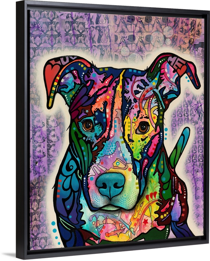 <p>Colorful painting of a pit bull with abstract markings on a purple background with faint black dog illustrations.</p>