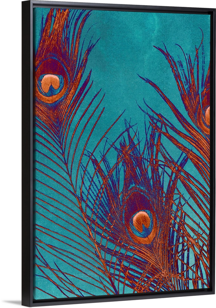 <p>Contemporary home decor artwork of red and purple peacock feathers against a teal background.</p>