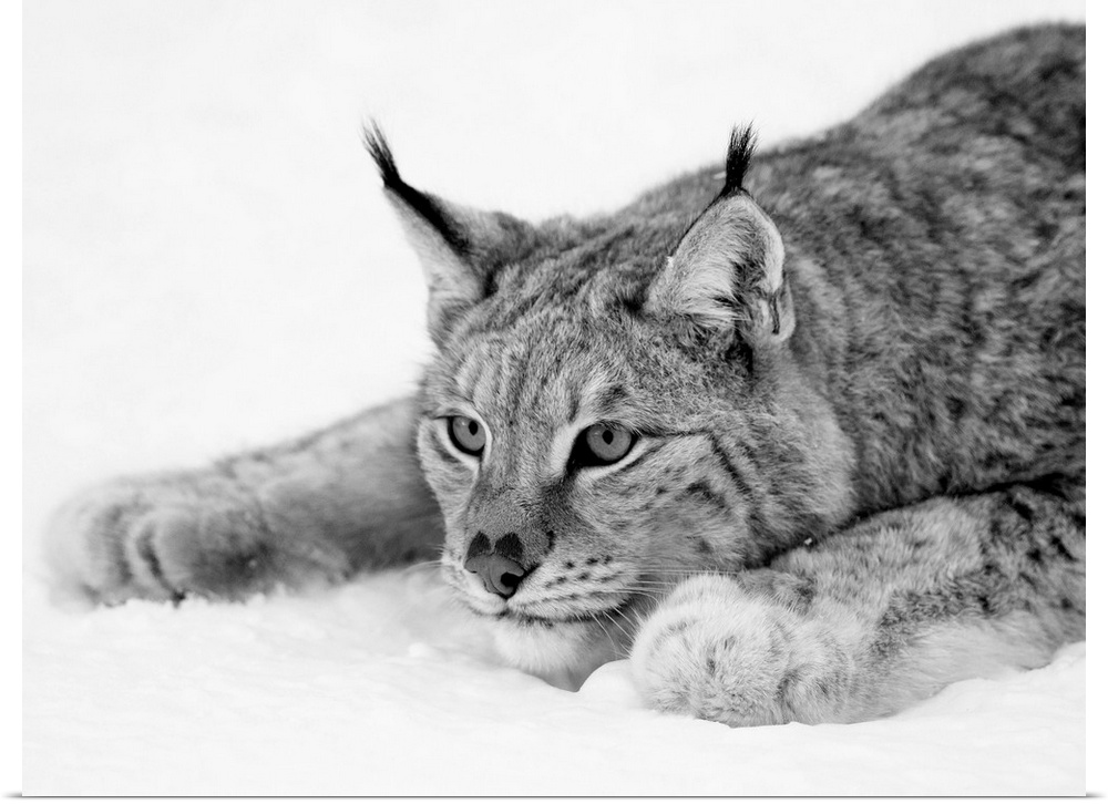 <p>Black and white photograph of a lynx in the snow.</p>