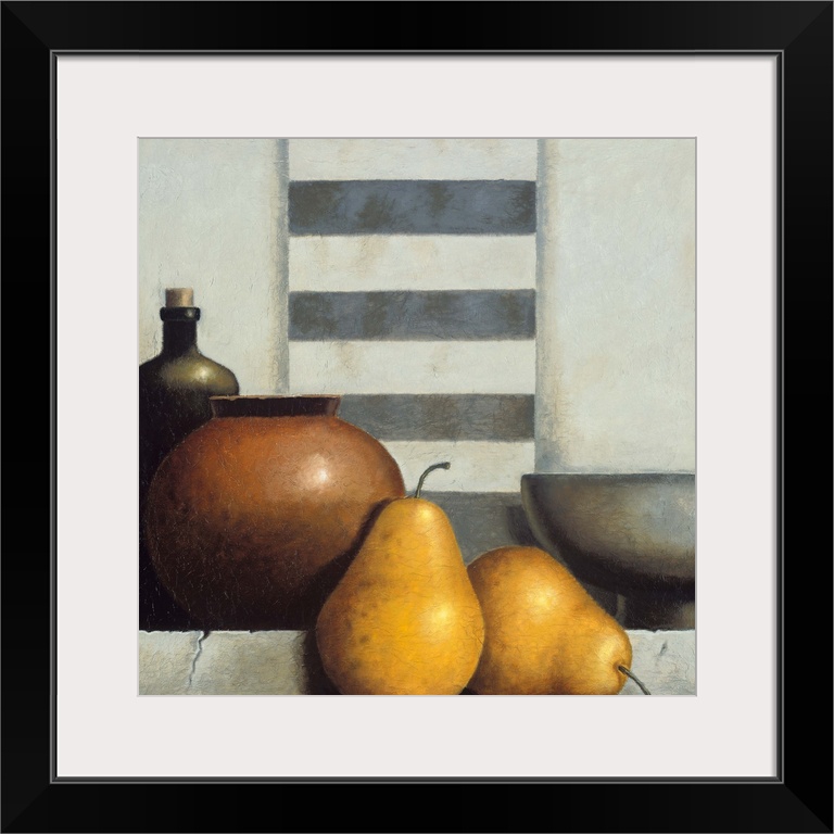 <p>A contemporary painting of a still life of vases and fruit.</p>