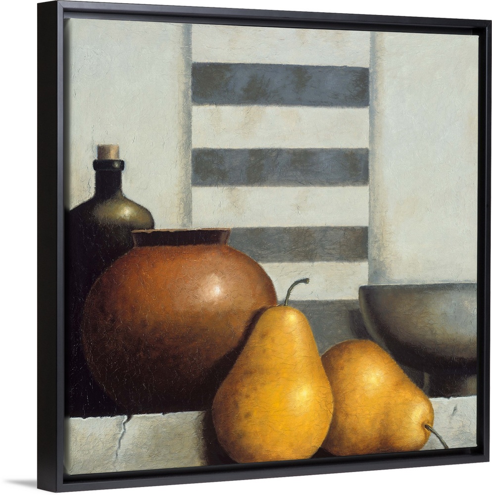 <p>A contemporary painting of a still life of vases and fruit.</p>