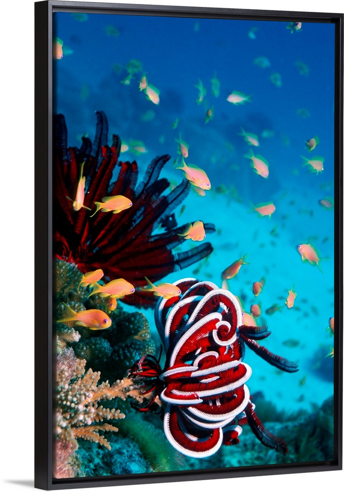 <p>Lyretail anthias (Pseudanthias squamipinnis) and a crinoid or featherstar (bottom) on a coral reef. The lyretail anthias is also known as the sea goldie. It can reach up to 15 centimetres in length and is found throughout the Indo-West Pacific region. Crinoids feed by filtering food particles from the water using their feathery arms, the hairs of which pass food to a central mouth. They inhabit shallow and deep waters across the world's oceans. Photographed off Bangaram, Lakshadweep, India.</p>