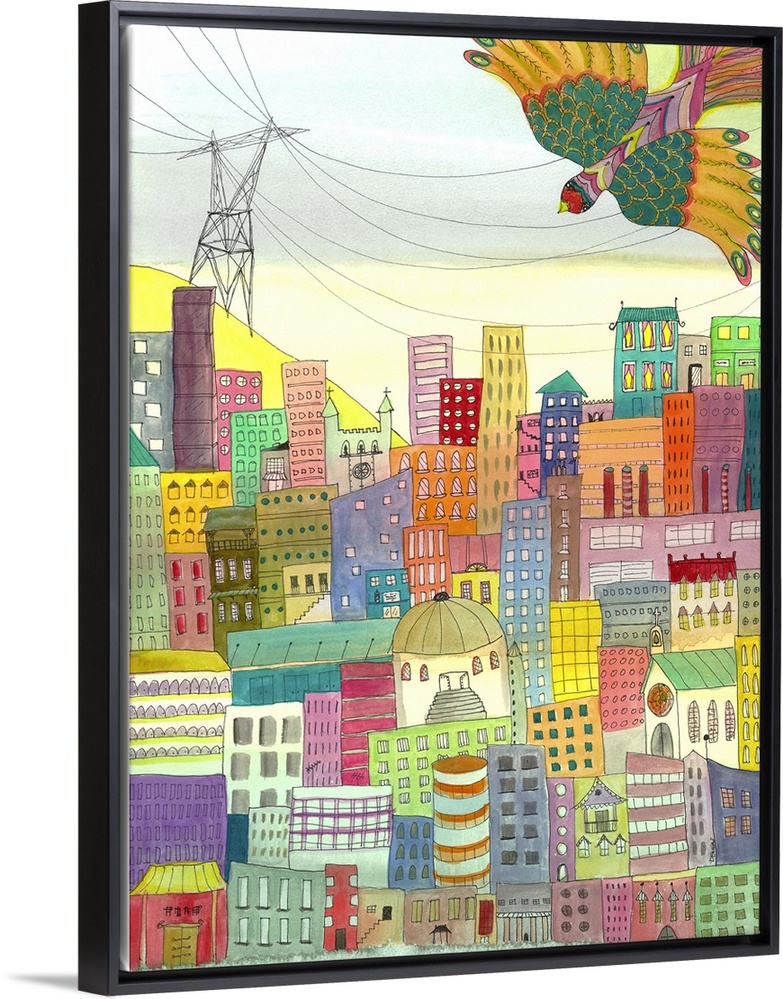 <p>Contemporary painting of a city of colorful buildings.</p>