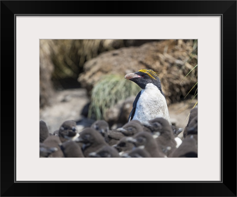 <p>Macaroni Penguin in colony of Southern Rockhopper Penguins on Bleaker Island, Falkland Islands.</p>