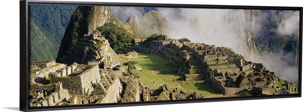 <p>Oversized landscape photograph of Machu Picchu in the sunlight, thin clouds in the background, in Peru.</p>