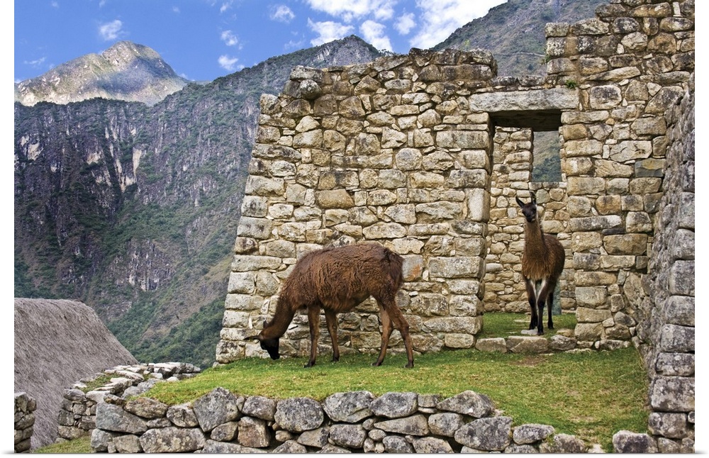 <p>Machu Picchu, Peru, Llamas graze in the ruins of the ancient Lost City of the Inca.</p>