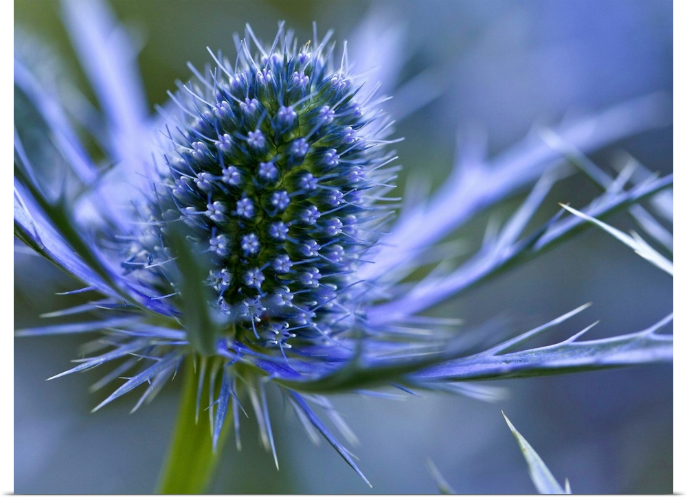 <p>Macro image of Sea Holly perennial with hairless and usually spiny leaves, and dome-shaped umbels of flowers resembling those of thistles.</p>