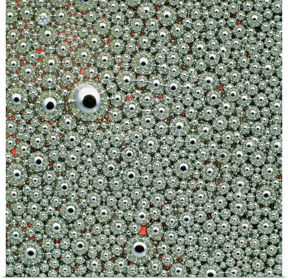 <p>Macrophotograph of small droplets of mercury, which are suspended in oil to prevent them from fusing together.</p>