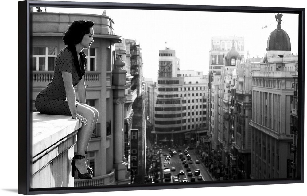 <p>A woman sits on a ledge overlooking the streets of Madrid.</p>