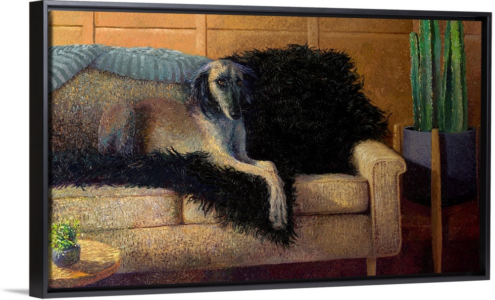 <p>Brightly colored contemporary artwork of a dog sitting on a couch.</p>