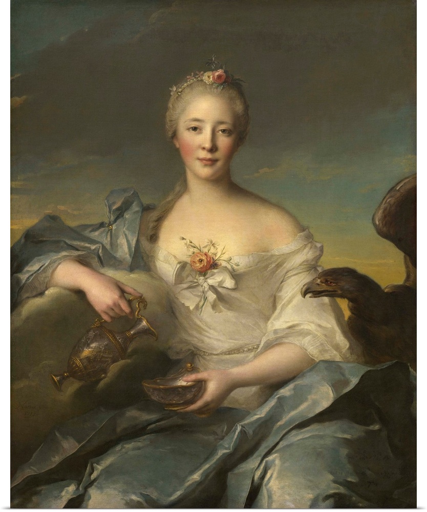 <p>Madame Le Fevre de Caumartin as Hebe, by Jean-Marc Nattier, 1753, French painting, oil on canvas. Nattier often painted allegorical portraits of Louis XV's courtiers, such as this lady as Hebe, the ever-young cupbearer of the Greek gods. She holds a pitch</p>