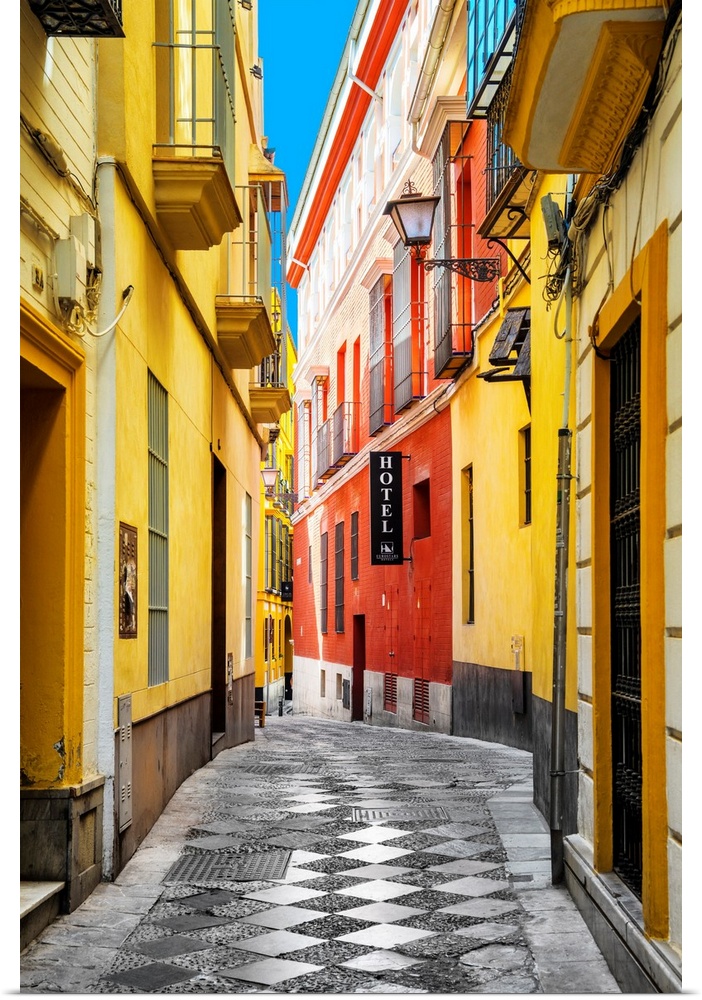 <p>It's a traditional spanish street with colorful facades in the city of Seville in Spain.</p>
