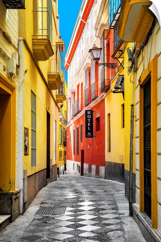 <p>It's a traditional spanish street with colorful facades in the city of Seville in Spain.</p>
