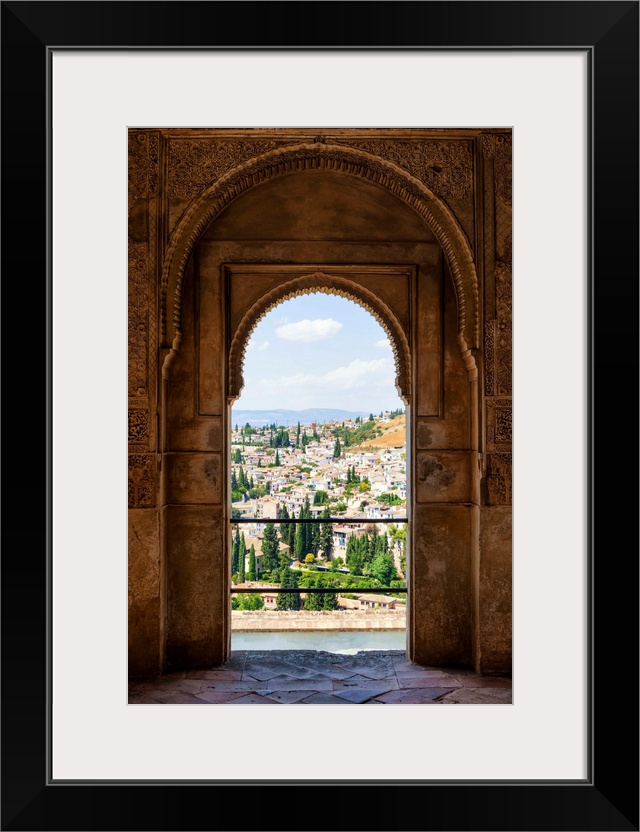 <p>It's a view of the city of Granada by the ancient arches of the Alhambra, Spain.</p>