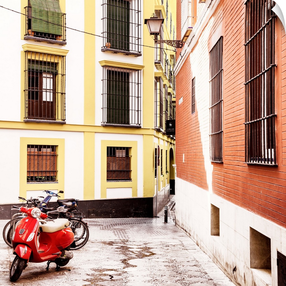 <p>It's a traditional spanish street with colorful facades and a red scooter in the city of Seville in Spain.</p>