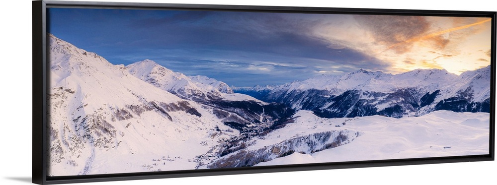<p>Aerial panoramic by drone of Madesimo and Andossi during a winter sunset, Valchiavenna, Valtellina, Lombardy, Italy, Europe</p>